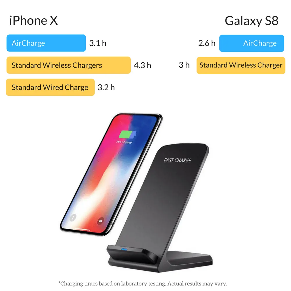 Available in black or white, the wireless charging stand allows you to charge your iPhone X, iPhone 8,Samsung Note9, Galaxy S9, and all other Qi-enabled smartphones. Aircharge Wireless Charger is upto 1.5x faster than standard wireless charging, reducing total charging time up to 50 minutes(dependent upon phones received capacity)!